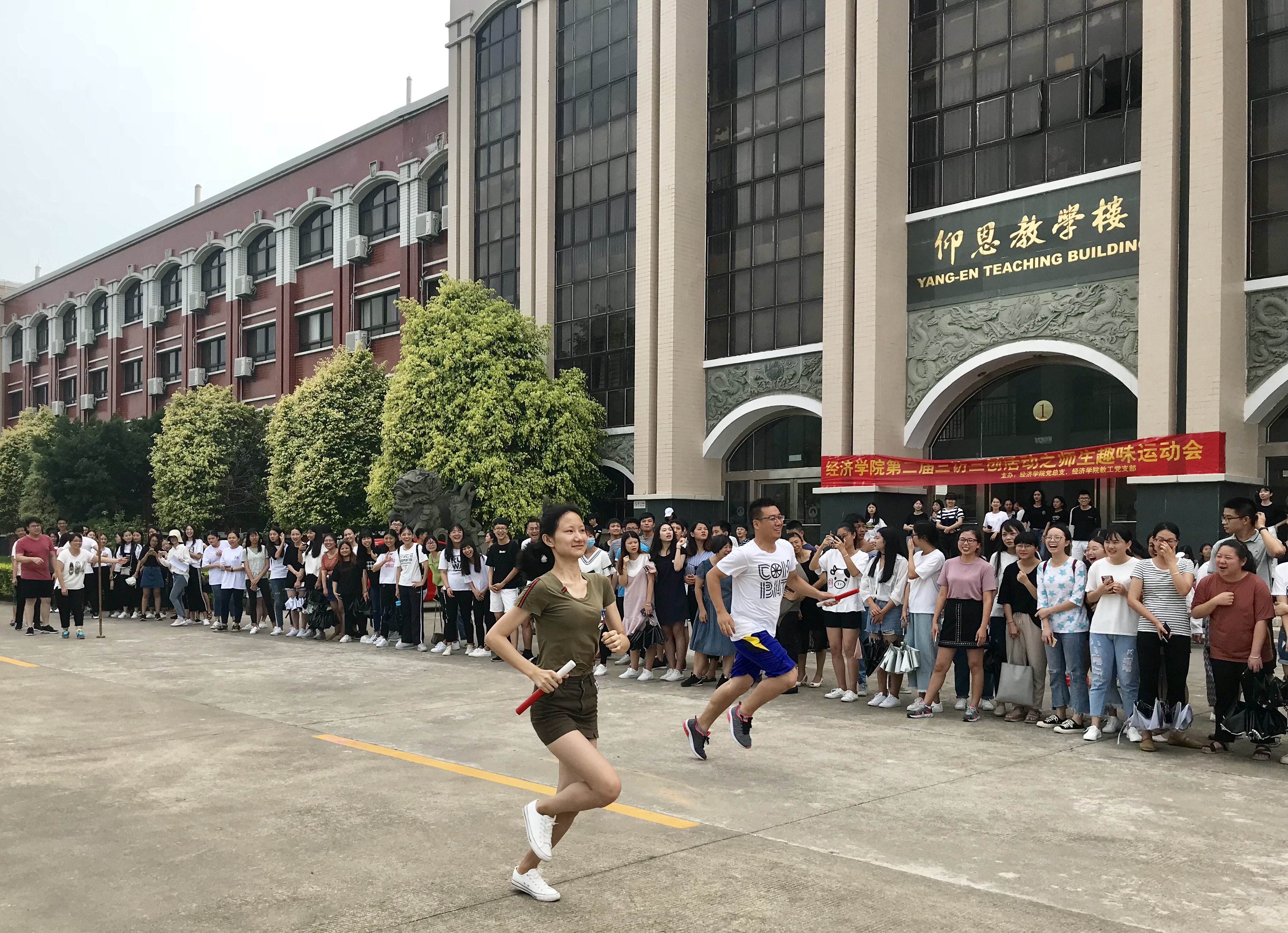尽管烈日炎炎,现场人头攒动情绪高涨,各支队伍皆跃跃欲试,充分做足热身准备,争分夺秒练习比赛项目。在50米迎面接力赛中,选手们紧握接力棒,似离弦之箭向前冲刺,加油呐喊声此起彼伏,接力棒的交接牵引着全体观众的心。比赛过程中出现掉棒失误选手,其余队员不甘示弱,奋起直追。经过两个回合排名比赛,最终由用时最短的经济系取得项目第一。五人六足、趣味接力赛、穿越呼啦圈项目则考验师生协作默契。赛前,参赛选手摩拳擦掌,寻找加快速度、保持平衡的方法。比赛现场热烈激昂,加油声如潮水般一浪高过一浪,各支队伍精神抖擞,紧密配合,团结协作,奋勇争先。经过激烈的比赛后,师生欢声笑语其乐融融,于仰恩楼正门合照留念。