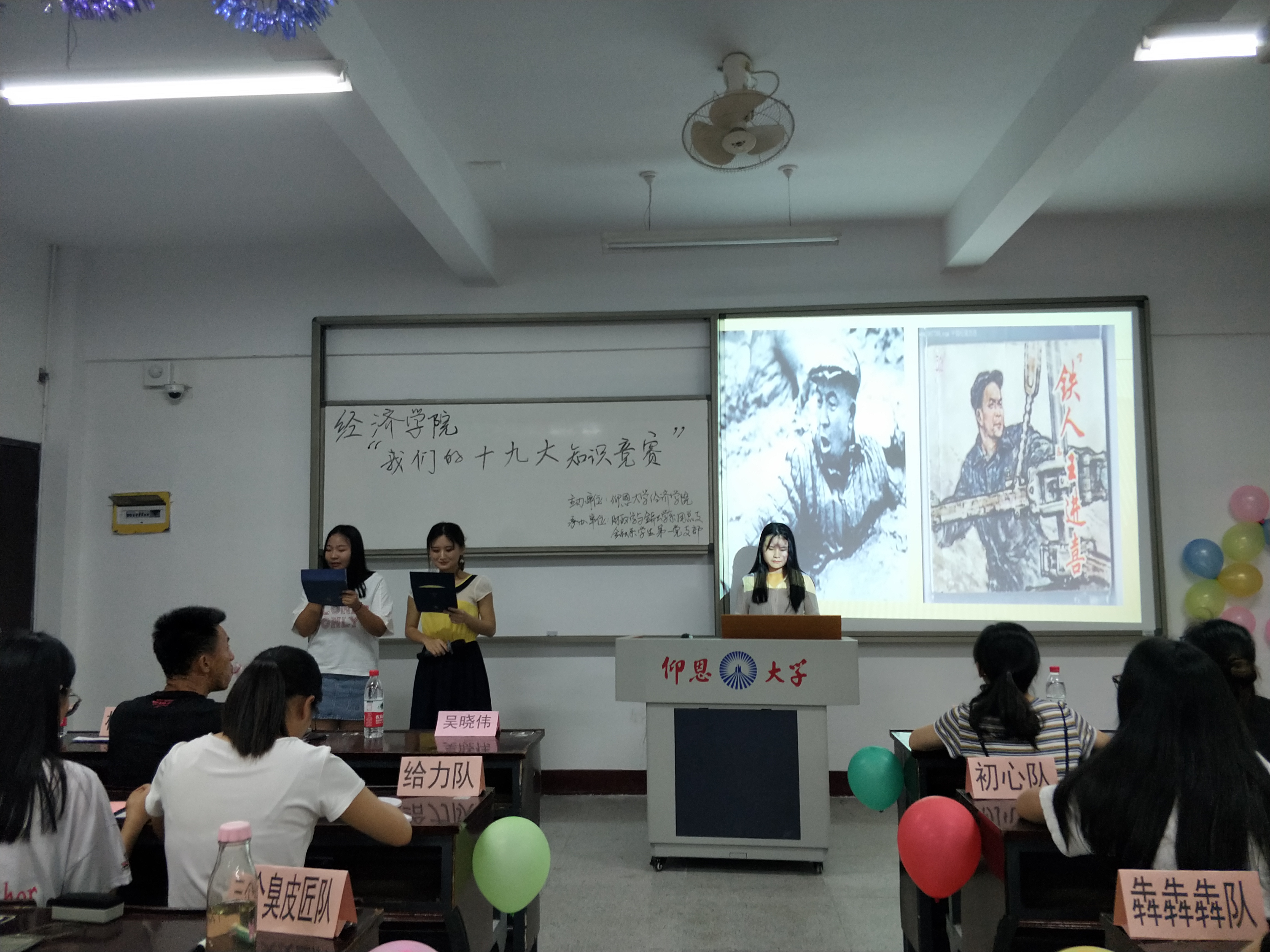 活动伊始,主持人依照抽签顺序介绍各支参赛队伍进行主题演讲和团队展示环节,每支队伍朝气蓬勃,尽显队伍特色风采。紧接着进行的是知识抢答及红歌猜歌名环节,各支参赛队伍竞争激烈,反应迅速,竞相展现“十九大”的丰富知识储备,正确率极高,一时难分仲伯,气氛一度推向高潮。活动中场更进行了紧张刺激的抢红包抽奖环节,现场情绪高涨,气氛十分热烈。之后,主持人让现场观众从各支队伍中票选出“最佳风采奖”并举行颁奖仪式。活动进入尾声,何丽玲老师进行点评,她赞赏本次参赛选手对本次知识竞赛做的充分准备,更希望同学们能“不忘初心,牢记使命”,在日常学习生活中践行十九大精神。