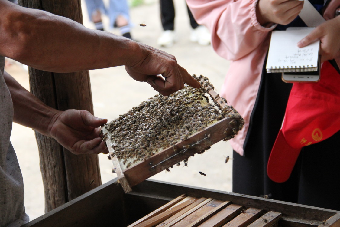 当天,实践队还参观了另一个激励性扶贫项目--蜜蜂养殖,中赤乡党委和政府为贫困户解决养殖困难并采取激励措施,有效的调动了贫困户的养殖积极性,提高了贫困户收入,为贫困户“脱贫摘帽”夯实基础,并已实现壮畲村、万营村贫困户全面脱贫。