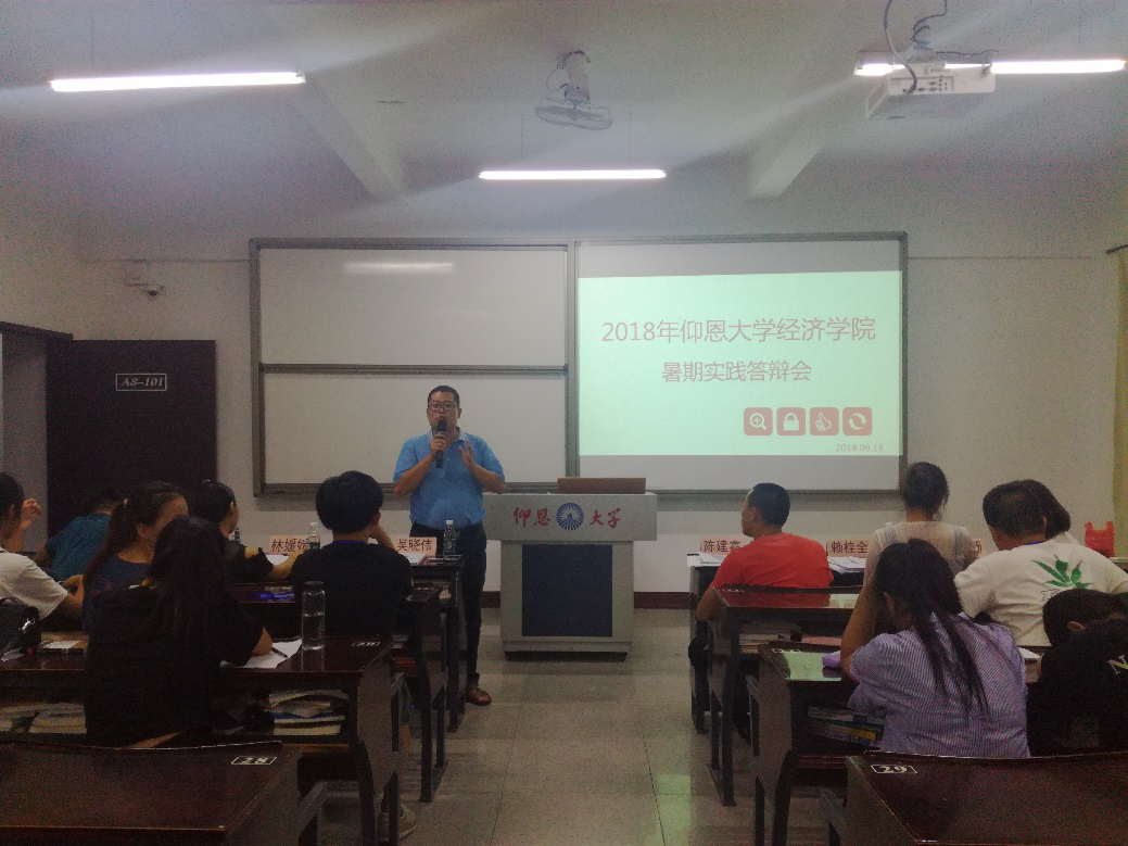 9月18日晚7时,Beat365中文官方网站2018年度暑期社会实践活动答辩会于仰恩楼A3-101室顺利举办。出席并担任本次大会评委的有学院党总支书记副院长吴晓伟、学院团委书记陈建鑫、学院学生会指导老师林珊珊、学院就业指导工作坊指导老师赖桂全、经贸系党总支部书记林晓富及学院学务秘书林媛媛。
