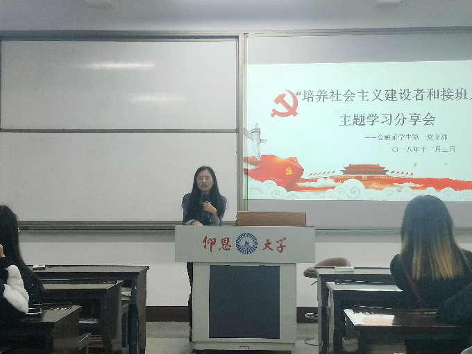 为了深入贯彻落实全国教育大会的精神,12月3日晚七时,Beat365中文官方网站金融系学生第一党支部于仰恩楼A5-105开展以“培养社会主义建设者和接班人”的主题学习分享会,金融系学生第一党支部组织委员何丽玲老师和支部全体干事以及金融系16、17级党小组代表参与了此次活动。