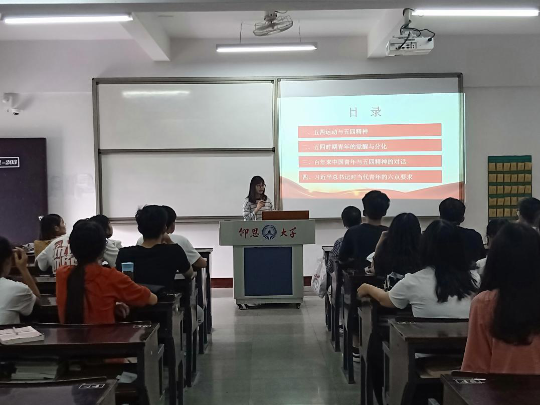 (图为支部干事林惠卿宣讲PPT材料) 会议首先由支部干事林惠卿通过PPT向大家介绍了五四运动具体情况与五四精神内涵、五四时期青年的觉醒与分化、百年来中国青年与五四精神的对话及习近平总书记对当代青年的六点要求等四个方面的内容;随后支部书记林丽华强调了当代青年应继续发扬五四精神,提出要将五四爱国精神细化到学习生活工作中,在国家、学校或者班级需要大家的时候挺身而出;最后,组织委员仲平老师发表了他的学习感想,他认为当今的爱国精神不一定是要通过牺牲自己来体现,承担起自己的责任也是一种爱国的体现。