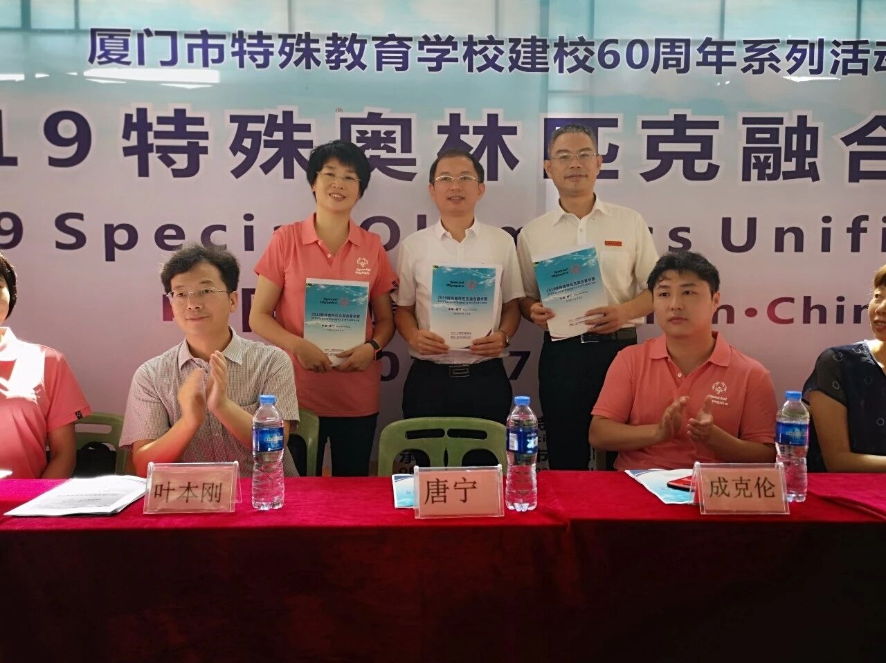7月8日星期一,Beat365中文官方网站papazao实践队前往厦门城市职业学校参加了由上海特殊关爱基金会主办、厦门市特殊教育学校承办的“特殊奥林匹克融合夏令营”的开营仪式与初次训练。