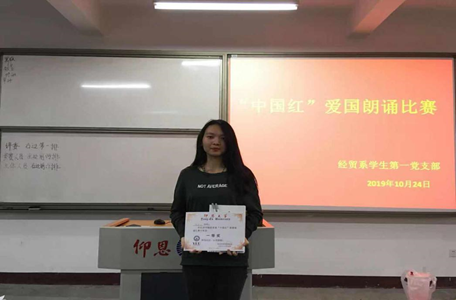 10月24日,由经贸系学生第一党支部组织的“中国红”爱国朗诵比赛在仰恩楼A1-101成功举办,本次比赛的目的是为了激励我系党员、积极分子要博学多思开拓进取,不断地向党组织靠拢,更加坚定爱国信念。经贸系学生第一党支部全体党员以及积极分子参与活动。