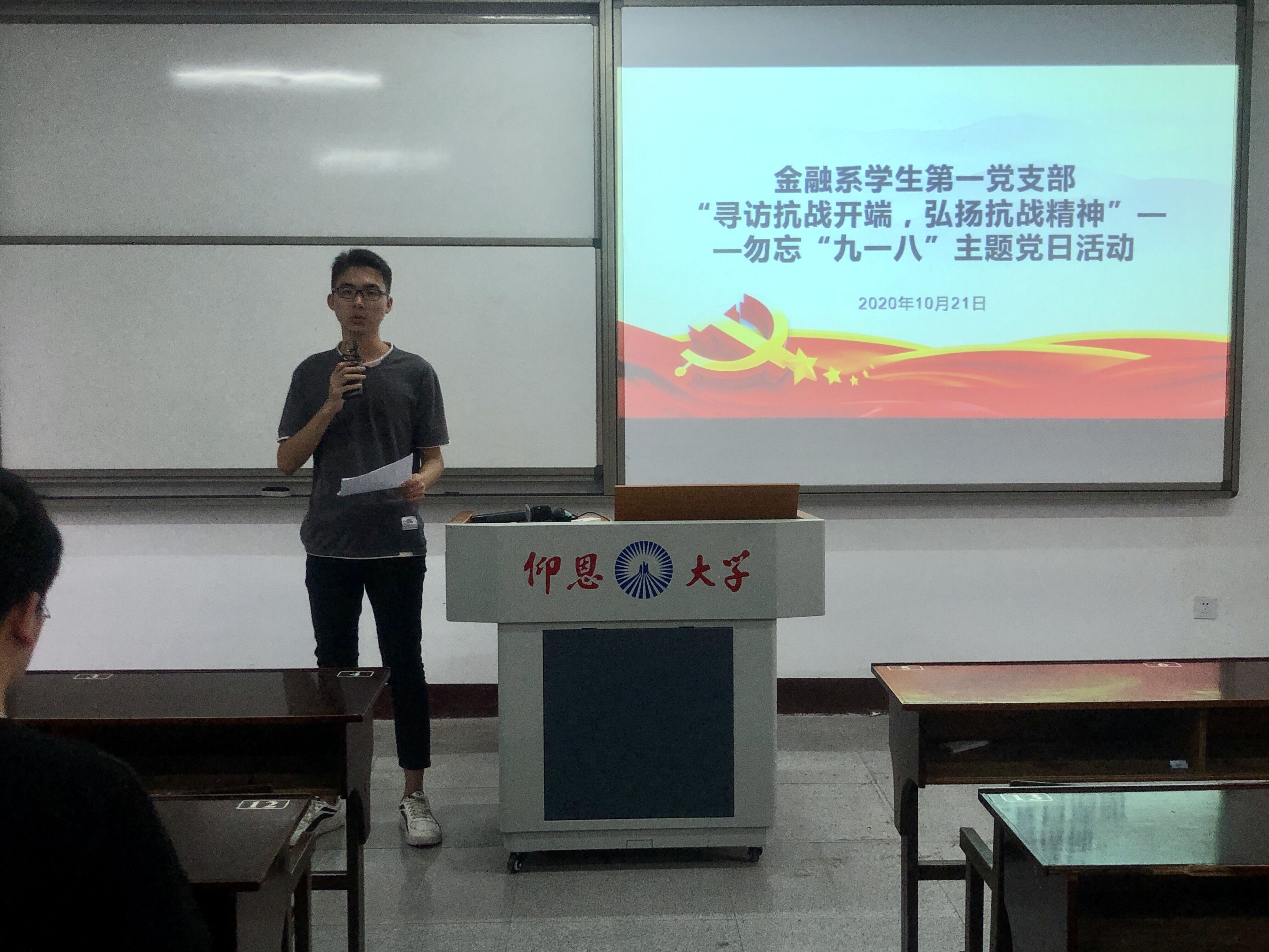 2020年10月21日,Beat365中文官方网站金融系学生第一党支部于仰恩楼D2-401开展“寻访抗战开端,弘扬抗战精神”——勿忘“九一八”主题党日活动。本次活动参会人员有支部组织委员何丽玲、支部全体党员和18级、19级各班积极分子代表。