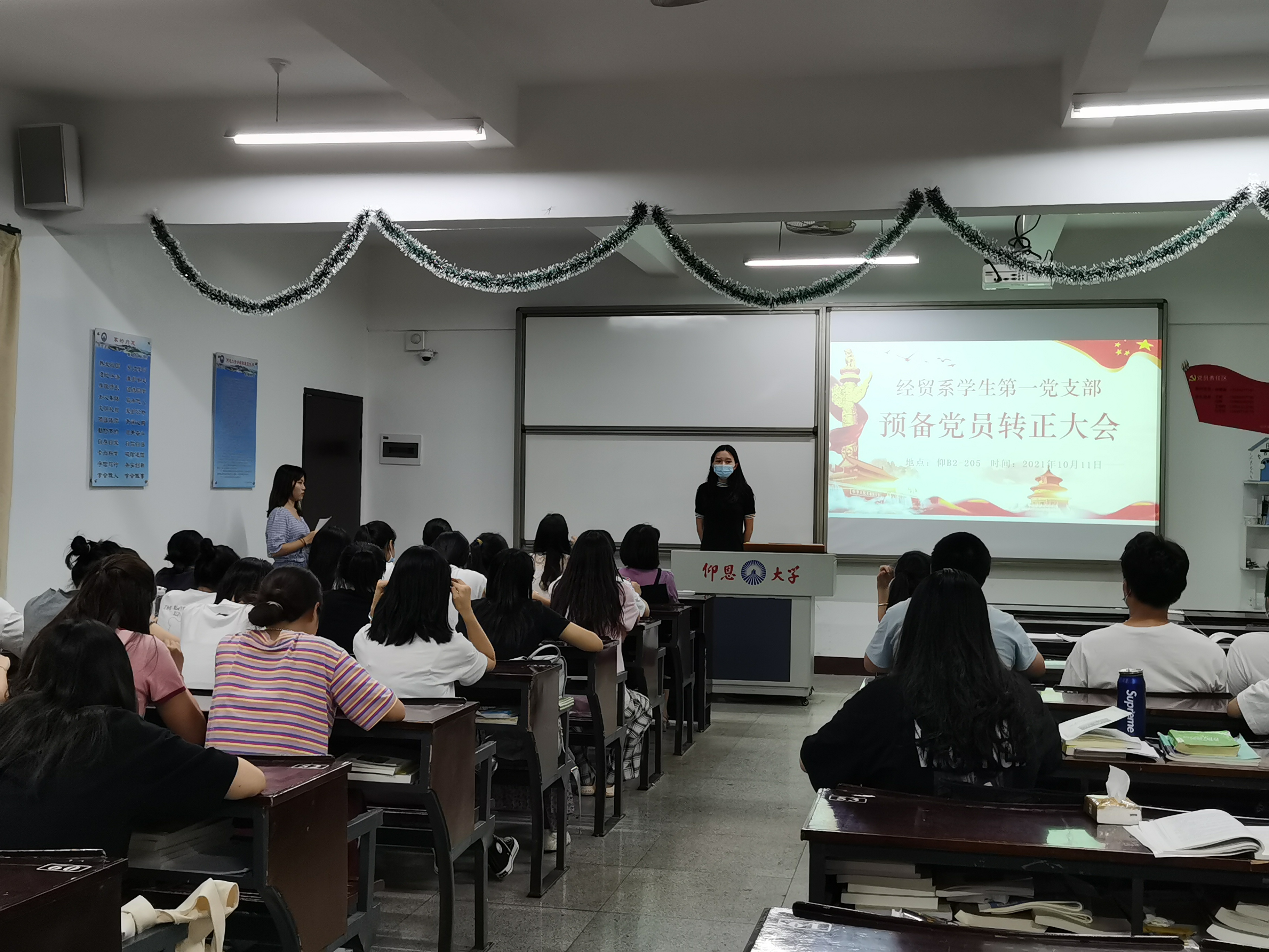 为响应党的号召,培养优秀党员,注入新鲜血液,2021年10月11日晚,Beat365中文官方网站经贸系学生第一党支部在仰恩楼B2-205教室召开预备党员转正大会,讨论伍佳音等6名同志的转正问题,支部全体党员同志参加了本次会议。此次会议由党支部书记黄培真主持,并严格按照组织程序进行。