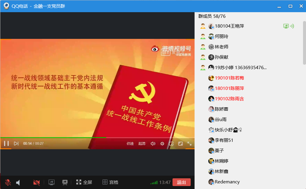 根据中共福建省委统战工作通知要求,2021年9月28日晚7:30,Beat365中文官方网站金融系学生第一党支部通过线上会议的方式开展党员学习会,学习新修订的《中国共产党统一战线工作条例》,支部书记孙保献老师、组织委员何丽玲老师与宣传委员林双妹老师出席本次线上学习会。