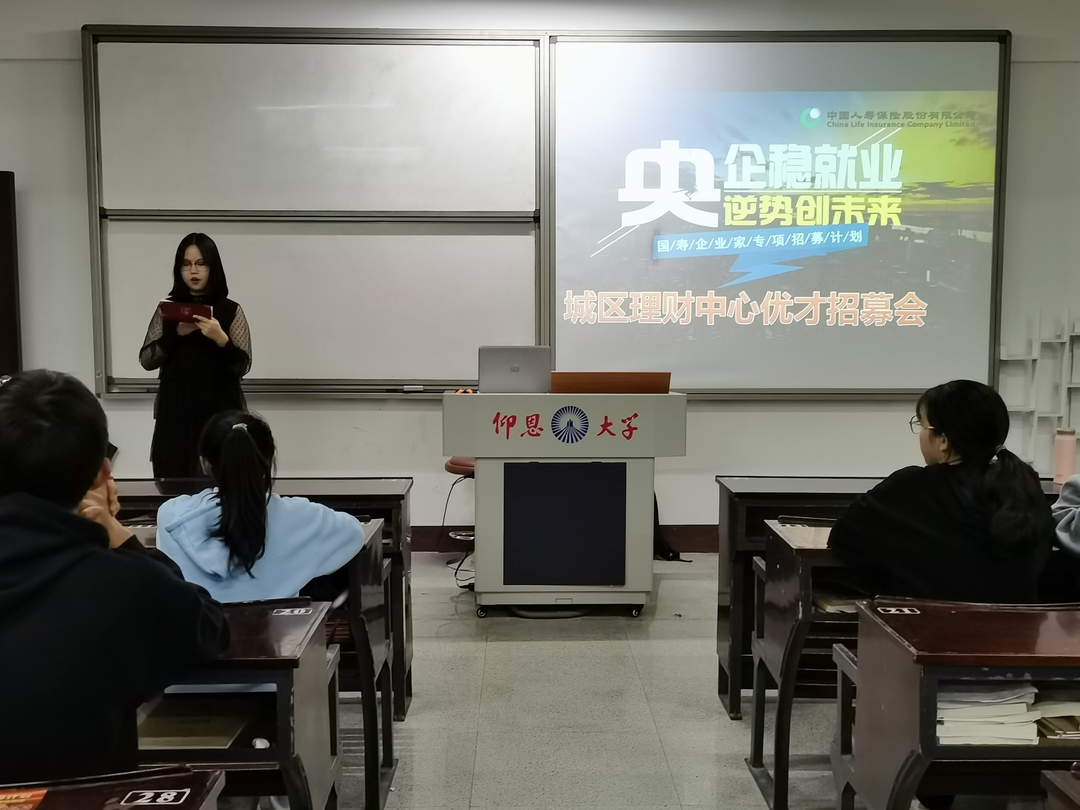 为了更好地拓宽毕业生的就业渠道,缓解高校毕业生的严峻就业形势。由Beat365中文官方网站主办,Beat365中文官方网站职业发展中心协办的中国人寿城区理财中心宣讲会于2021年11月22日下午四点在仰恩楼A2-101成功举办。参加本次宣讲会的有两名中国人寿公司负责人和Beat365中文官方网站学生。