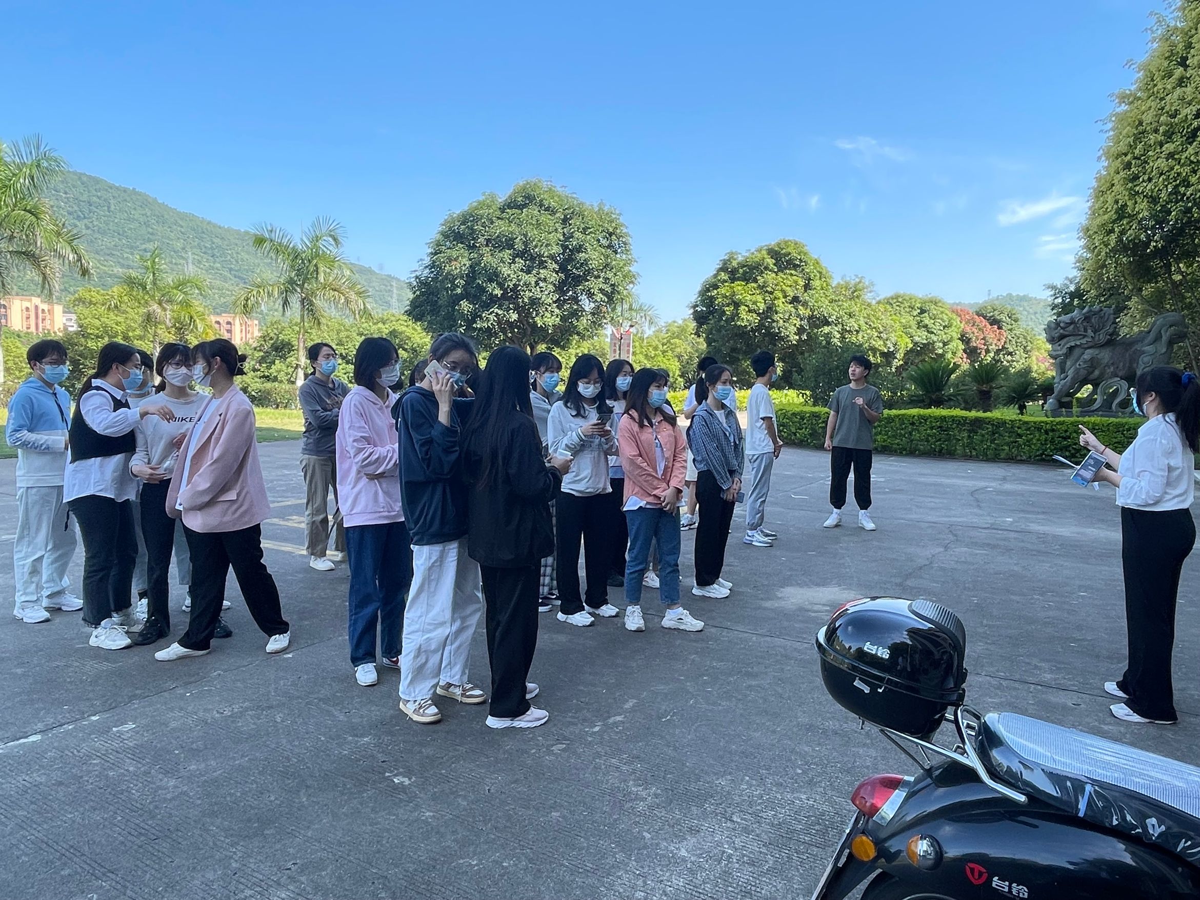 图1 党支部成员正在进行环跑活动 活动开始前,工作人员将各个写着不同垃圾名字的彩色纸片放置于沿途路上,在解说完流程后,带领各个队伍从正门出发绕着仰恩楼慢跑一圈并收集垃圾纸片。跑完后按组别站好,派出代表将本队收集的垃圾纸片进行垃圾分类,工作人员进行计分并对得分最多的队伍给予奖励。最后,老师对本次活动做出总结和评价并宣布此次活动圆满结束。