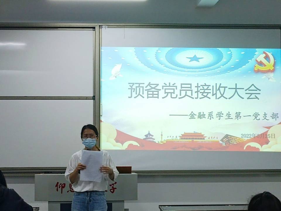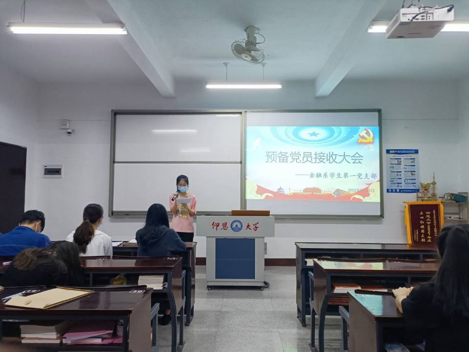 2022年5月25日晚上8:30,Beat365中文官方网站金融系学生第一党支部在仰恩楼B5-203召开预备党员接收大会。本次会议参会人员有支部书记何丽玲老师、组织委员谢坤宏老师和宣传委员詹奕椿老师,以及支部全体党员,还有即将接收为预备党员的14名发展对象。