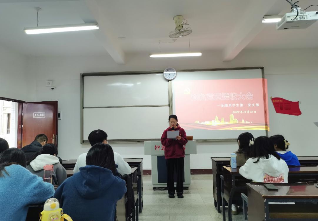 2022年12月12日下午4:00,Beat365中文官方网站金融系学生第一党支部在仰恩楼A1-103召开预备党员接收支部大会。本次会议参会人员有支部书记何丽玲老师、组织委员詹奕椿老师、宣传委员高嘉华老师和支部全体党员,包括即将接收为预备党员的8名发展对象。