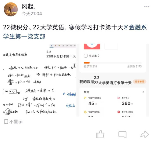 2023年1月24日至2021年2月4日,金融系学生第一党支部针对21、22级下学期初必修课考试以及20级的各类证书学习,组织开展“欢欢喜喜过好年,夯实基础不挂科”10天寒假复习打卡活动。此次活动旨在为20-22级同学们提供学习答疑的平台,帮助其充分利用寒假时间巩固知识点,通过必修课以及专业证书考试。