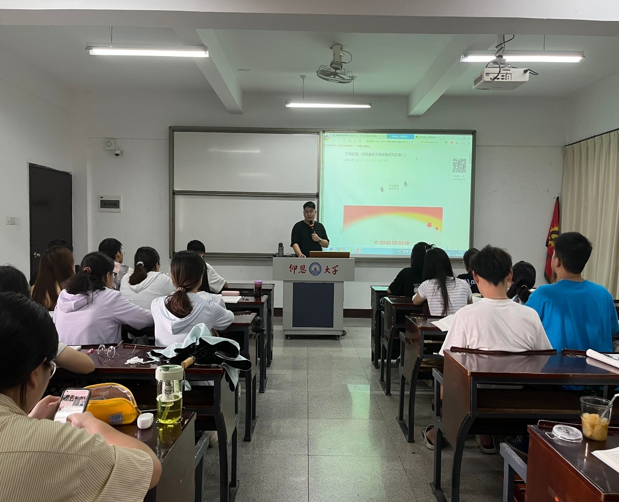 此次“创建省级文明校园应知应会”主题班会由各班级班主任领学,全面学习掌握文明校园创建应知应会知识,同时通过各种趣味问答形式加深师生对文明校园创建知识的认识了解,从多个角度加深对文明校园建设的认识,同时强调全体师生在文明校园创建中,务必积极合作配合。一个文明的校园,就必须要有一个文明的班风、学风。这需要全体师生积极行动起来,展现当代大学生的担当,做到文明校园,从自身做起,深化高等学校学生行为准则,树立志愿服务意识,培养担当民族复兴大任的时代新人。