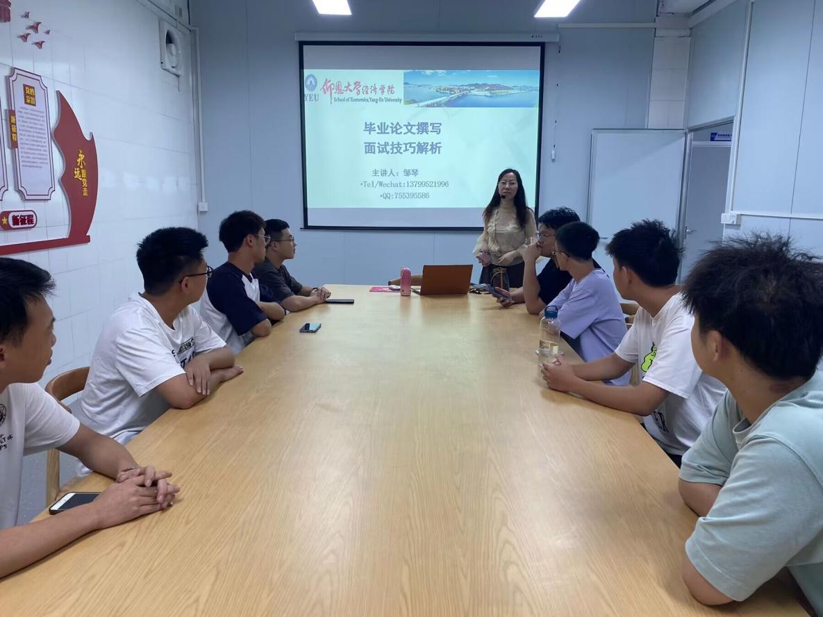 2023年11月9日19:00-20:30,Beat365中文官方网站经贸系邹琴老师作为值班学业导师入驻新区男生宿舍“一站式学生社区”宏船书院,为大四学生举办关于毕业论文撰写及求职面试讲座,为面临毕业压力的学生提供帮助。