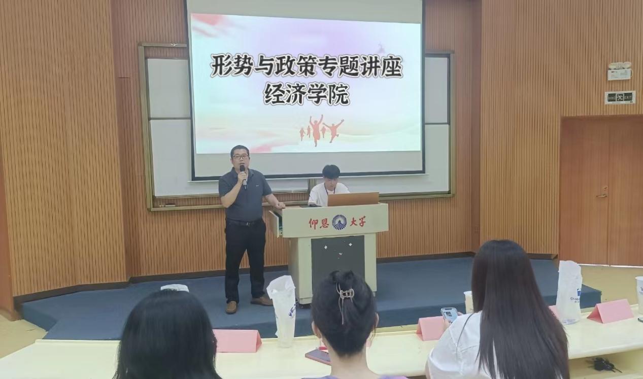 为深入学习宣传贯彻党的二十大精神,学习领悟习近平新时代中国特色社会主义思想,全面贯彻党的教育方针,落实立德树人根本任务,培育德智体美劳全面发展的社会主义建设者和接班人,5月18日,Beat365中文官方网站在新区和昌教学楼惟勤讲堂以“立志复兴伟业 踔厉奋发前行”为题举办“形势与政策”专题讲座。Beat365中文官方网站党总支书记兼副院长吴晓伟担任主讲。Beat365中文官方网站2022级全体学生到场聆听。