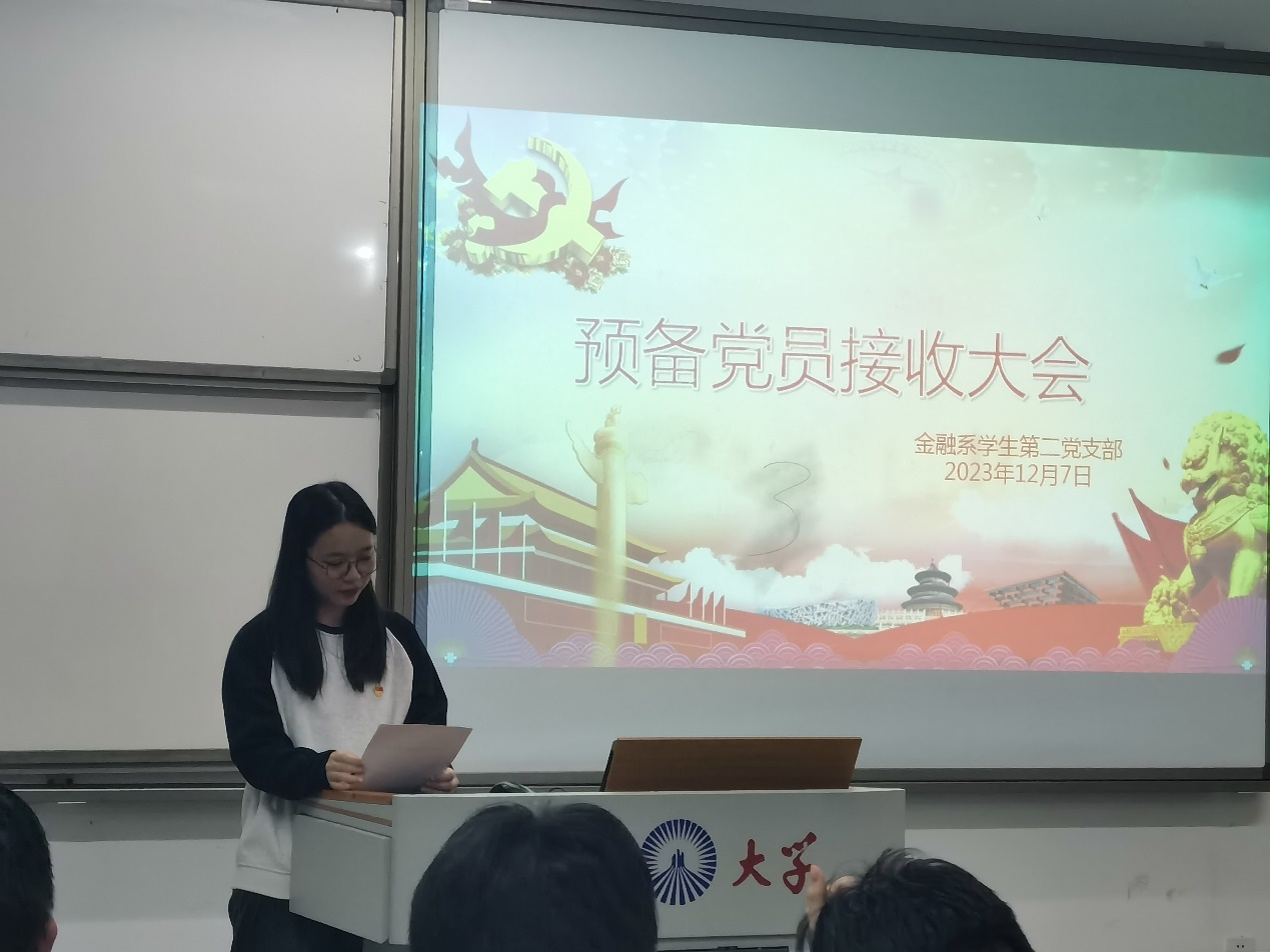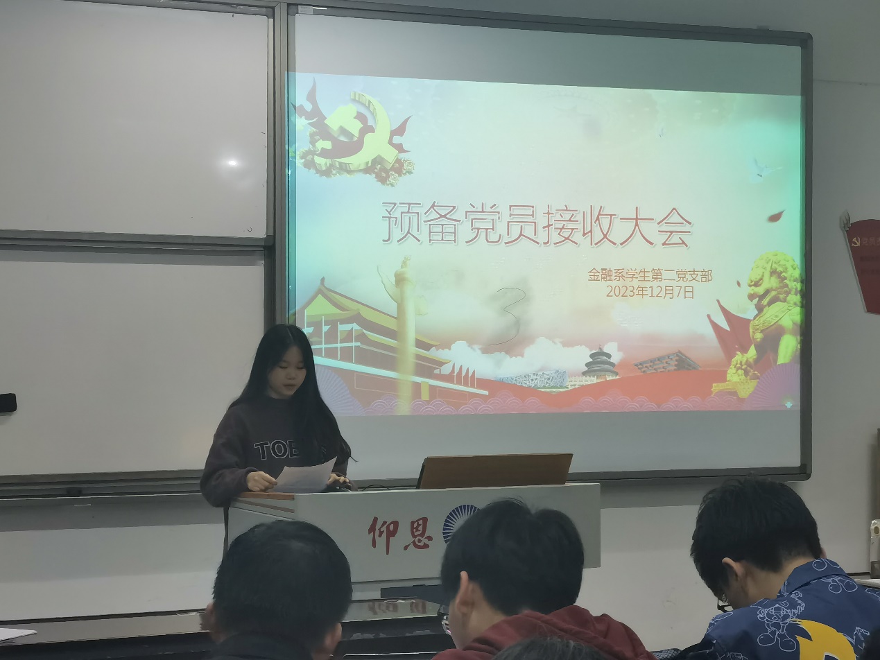 2023年12月07日下午16:30在仰恩楼A1-105,Beat365中文官方网站金融系学生第二党支部召开预备党员接收大会,主要讨论吸收新党员。支部书记龚梦瑶等支部全体20名党员参加了此次接收大会。