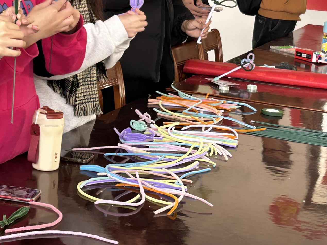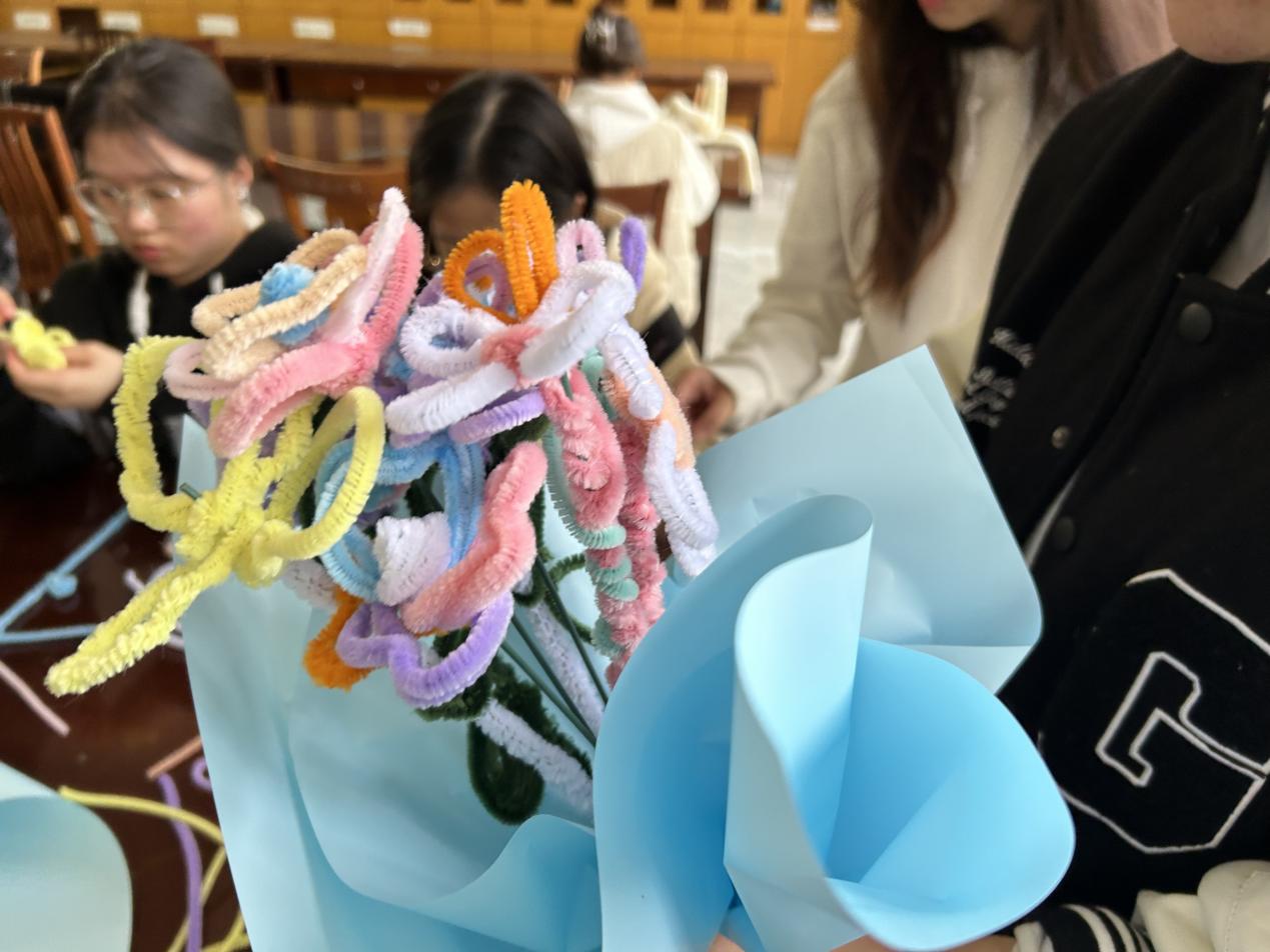 以文化人,以艺通心,支部同学在事先准备好的花束包装纸上进行精心涂鸦,提笔画世界,为“鲜花”制作做铺垫。为深入贯彻生态环保理念,支部用扭扭棒替代传统鲜花,以别具匠心的手工将朴素的材料变为永不凋零的“鲜花”,并将二者融为一体,形成一束束独具一格的花束。