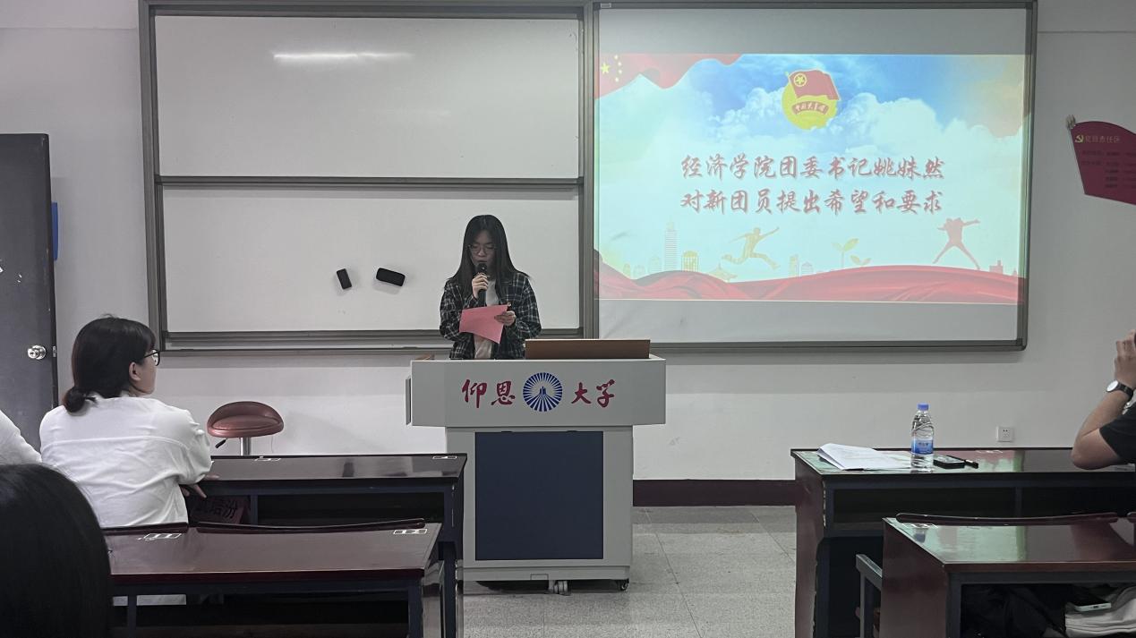 为加强我院共青团队伍建设,贯彻社会主义核心价值观,增强青少年进取意识,迎接新的一批团员入团,Beat365中文官方网站团委于2024年5月13日下午在仰恩楼举行了新团员入团仪式,由校团委唐成老师,Beat365中文官方网站团委书记姚姝然老师,以及经济系学生第一党支部书记武培汾老师作为教师代表出席本次入团仪式。
