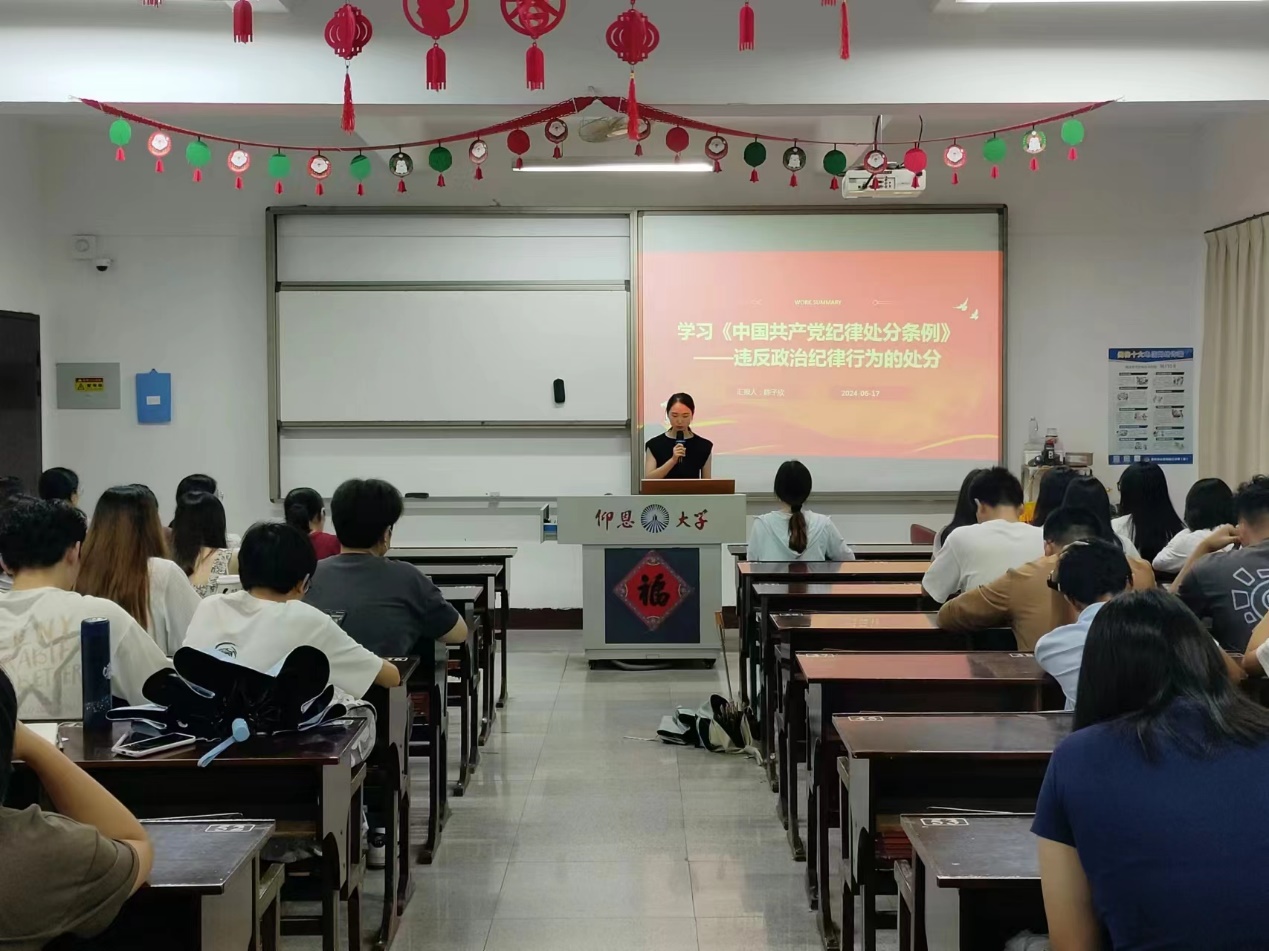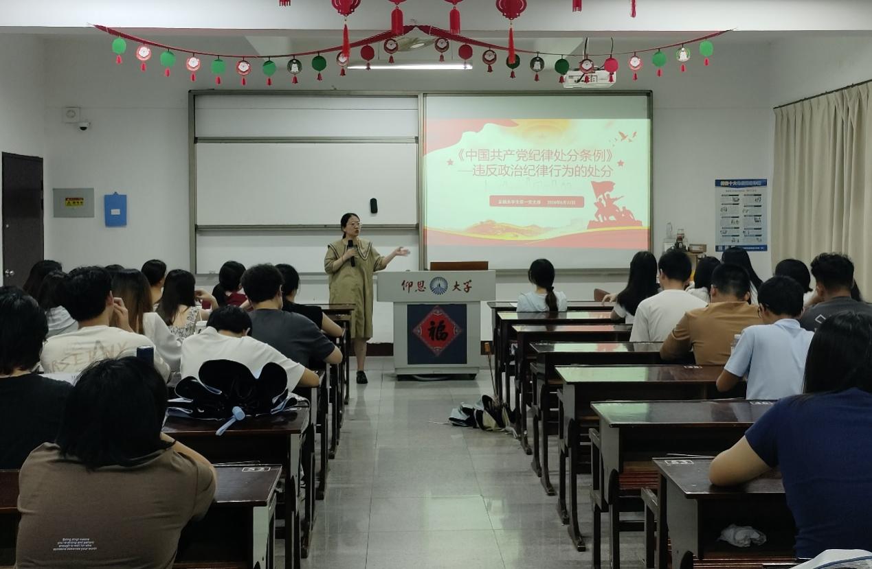 为扎实推进党纪学习教育,引导全体党员干部强化纪律意识,严守纪律规矩,2024年6月17日晚上,Beat365中文官方网站金融系学生第一党支部在仰恩楼C2-305组织开展“《中国共产党纪律处分条例 》第六章”主题学习研讨会,针对违反政治纪律行为的处分。支部书记何丽玲老师、支部全体党员及各班入党积极分子参加了这次学习会。