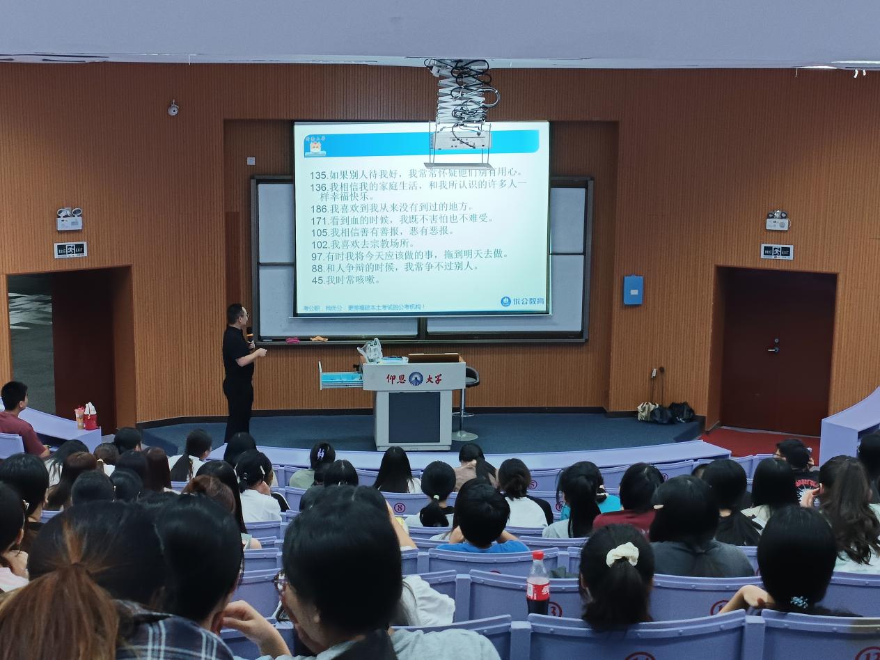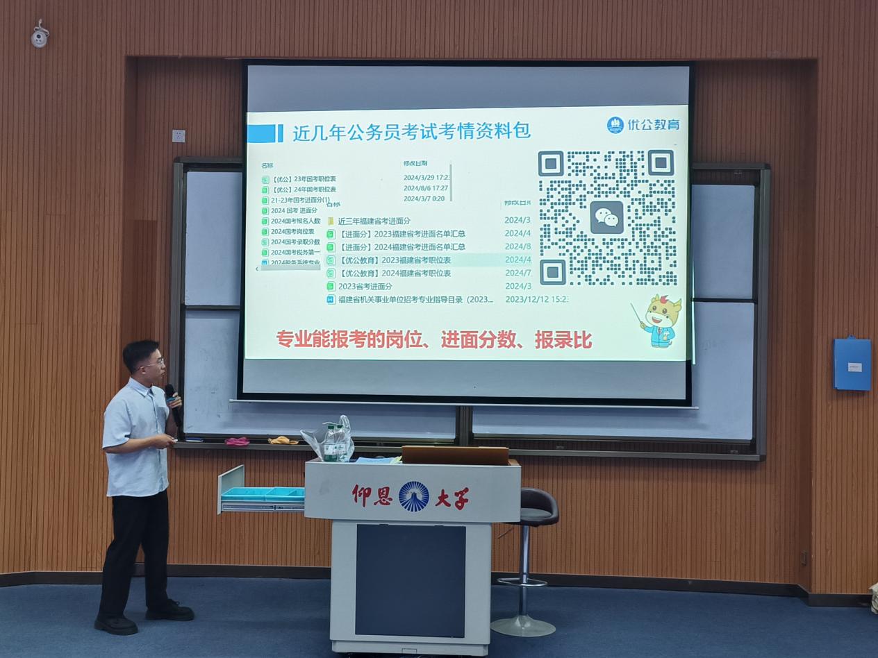 讲座伊始,先由优公教育的王老师主持本次公职类考试备考规划讲座的开幕,他通过简洁易懂的话语调动大家对考公内容的好奇。然后由主讲老师林啸给大家介绍了公考的基础要点和必了解事项,如国考、省考、选调生、事业单位、三支一扶报名、考试时间及流程等。其次,细致地讲解了选调生和三支一扶的在校量化评分表、近年来考公上岸例子、国考和省考的各自优势以及如何选岗四个方面并教给同学们一些实用的方法和技巧。最后,林啸老师以一道关于“乡村环境治理”的面试问题,向大家展示公考面试的灵活性,使经院学子对考公有了进一步的了解。