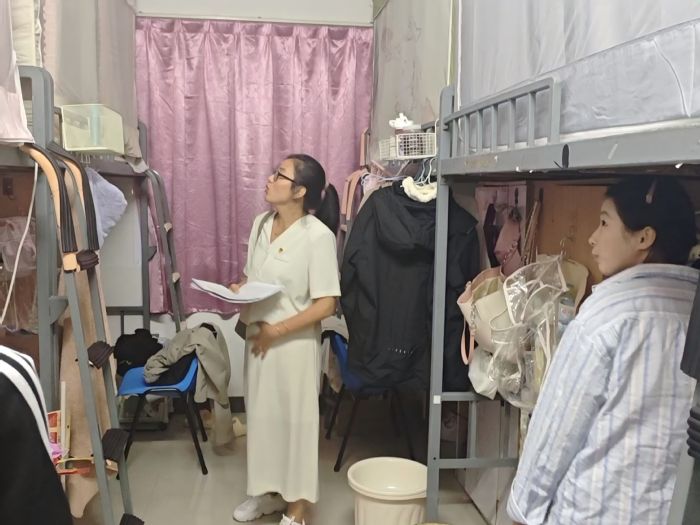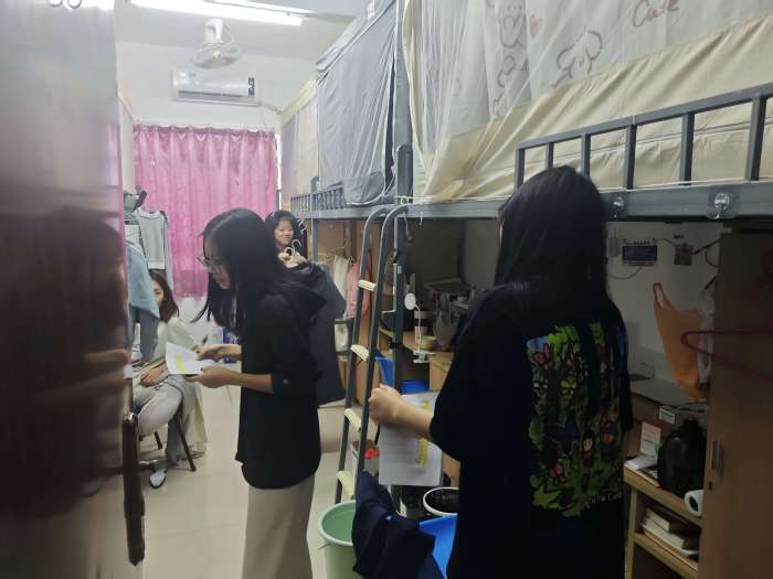 活动期间,老师带领积极分子、党员和24级劳动委员组成评审小组,深入各个宿舍,从宿舍卫生、物品摆放、文化氛围、安全状况等多方面进行了细致的检查和评估。在检查过程中,许多宿舍表现出色。有的一尘不染,床铺整洁,桌面物品摆放有序,地面干净光亮;有的布置独具匠心,文化墙贴满了舍友们的照片、励志标语和艺术作品,展现了团结友爱的宿舍情谊和积极向上的精神风貌。