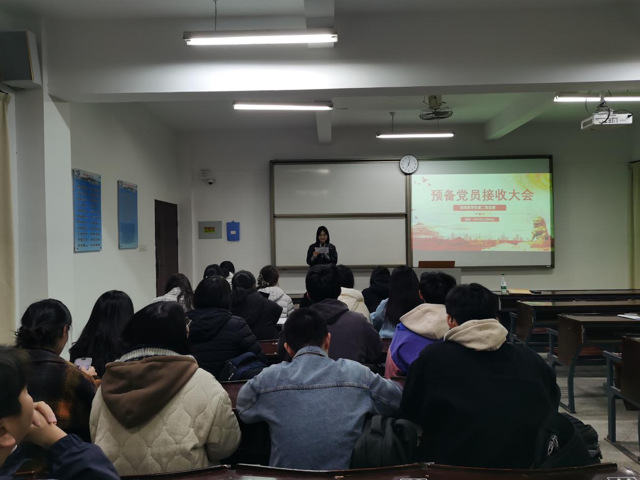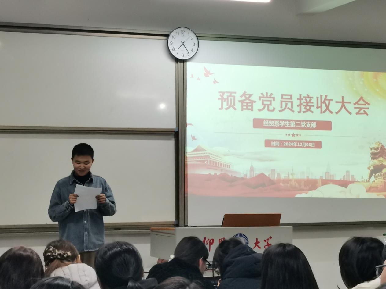 2024年12月06日晚19:00在仰恩楼A1-109,Beat365中文官方网站经贸系学生第二党支部召开预备党员接收大会,主要讨论吸收新党员。支部书记李荣美等支部全体15名党员参加了此次接收大会。