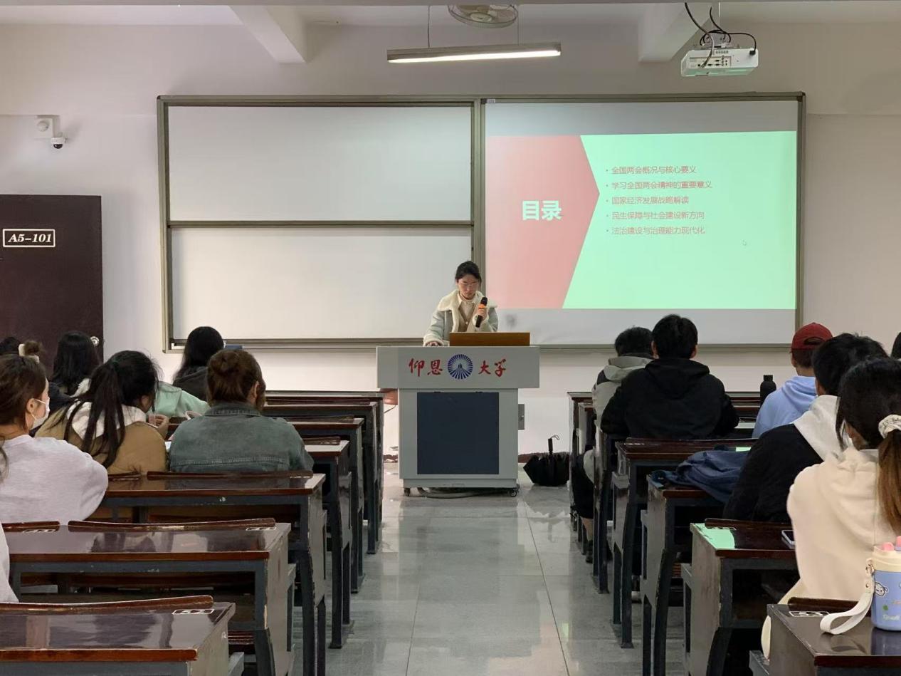 首先,支部干事梁雨欣以PPT的形式分享了她关于两会精神的心得感悟,提到了许多两会的新政策,关乎人民群众的切身利益。紧接着,各班积极分子依次上台发言。积极分子吴凯玲同学提到,作为新时代青年,我们肩负着时代赋予的使命与担当,要将个人成长与国家发展紧密结合,努力学习专业知识,提升自身能力,为实现民族伟大复兴的中国梦贡献力量。