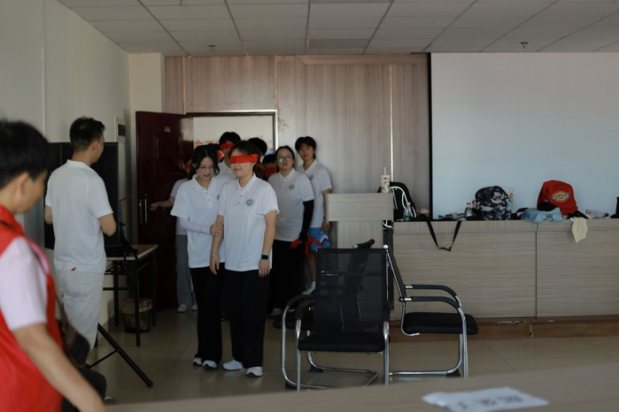 在轻松愉悦的氛围中,徐展部长通过趣味心理游戏,引导成员们敞开心扉、相互了解,迅速打破彼此间的陌生感。随后,一系列团队合作小游戏轮番上阵,成员们分组竞技,在沟通、配合中逐渐培养起默契,现场欢声笑语不断,团队的凝聚力在热烈的氛围中悄然提升。其中,“蒙眼同行”游戏将活动推向高潮。一名同学蒙上双眼,完全信任同伴的指引,另一名同学则小心翼翼地带领其穿越障碍。这一过程不仅考验着团队成员间的信任,更彰显了协作的重要性。