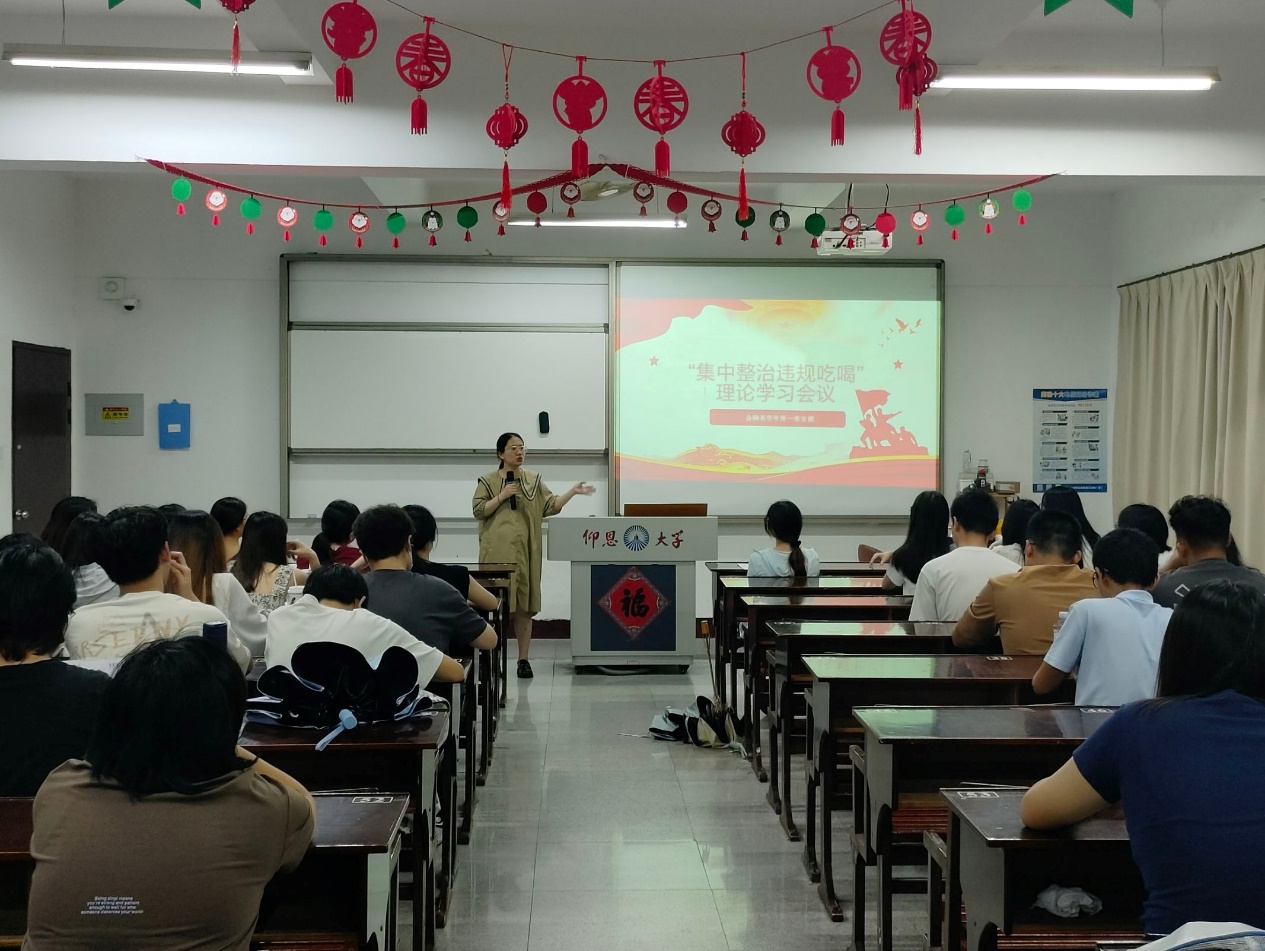 为深入贯彻落实中央八项规定精神,进一步加强党风廉政建设,强化党员的纪律意识和规矩意识,2025年6月20日,Beat365中文官方网站金融系学生第一党支部在仰恩楼A1-107组织开展“集中整治违规吃喝”理论学习会议。此次会议由党支部书记何丽玲主持,支部全体党员和各班入党积极分子参加了理论学习会议。