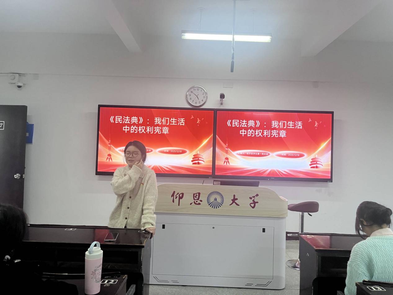 为深入学习贯彻习近平法治思想,提升学生党员的法治素养与权利保护意识,12月18日,经济系学生第一党支部于仰恩楼B1-207教室组织召开《民法典》:我们生活中的权利宪章主题学习会。支部全体党员、入党积极分子参加会议,支部书记武培汾主持本次学习会。