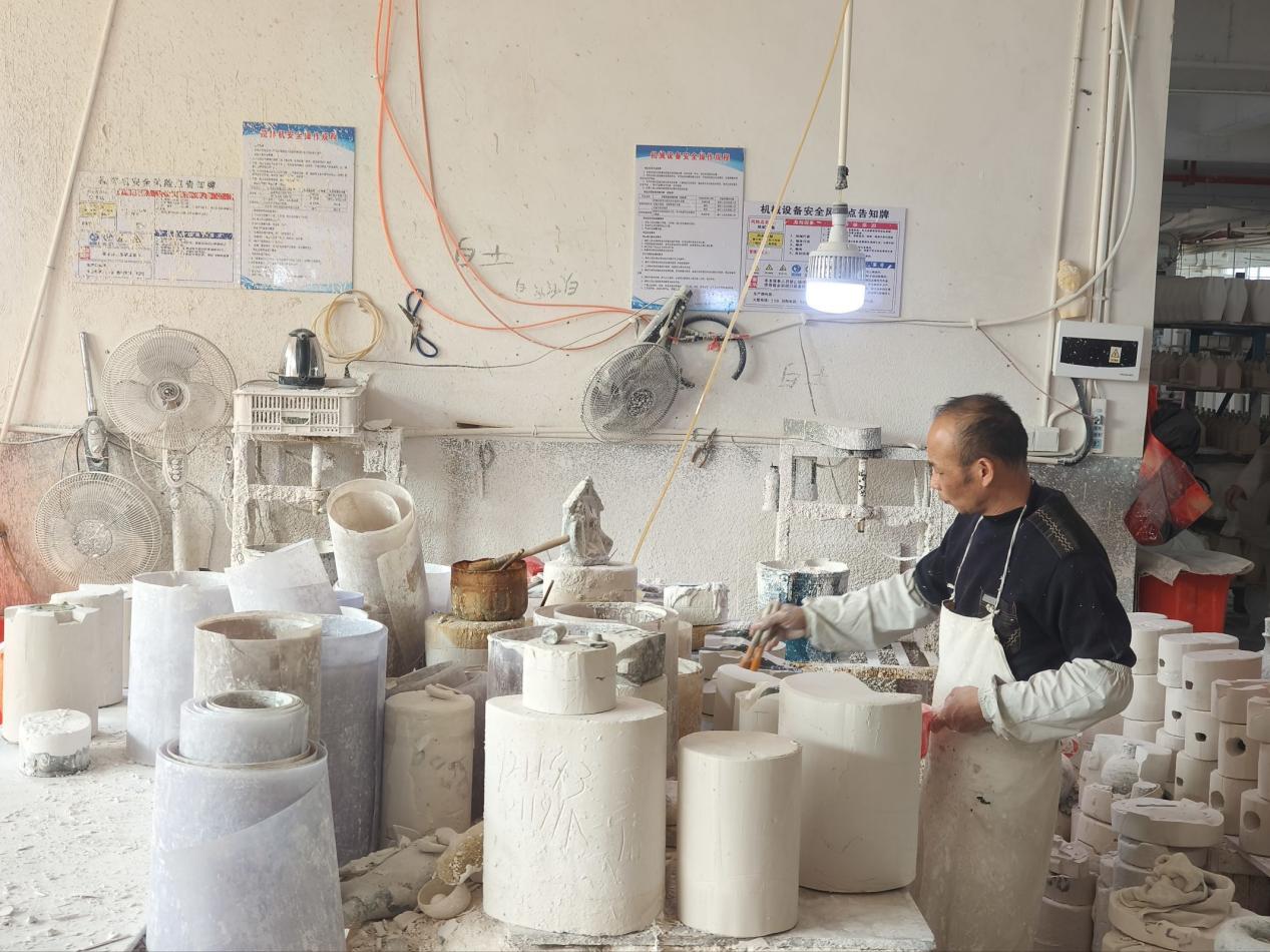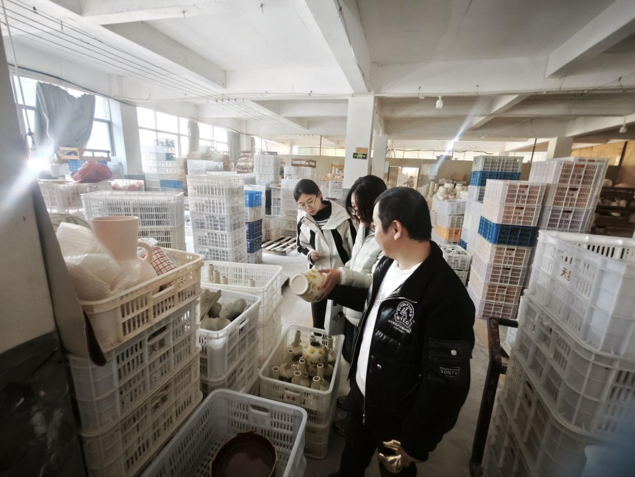 实践队走访2-3家代表性企业,其中涵盖传统手工作坊与现代化生产企业。在传统手工作坊中,匠人们沿用拉坯、修坯、施釉等千年技法,以手工劳作完成瓷土到工艺品的转化。现代化生产企业则通过自动化生产线与机械臂设备提升生产效率,依托数字化管理,传统工艺与现代科技的深度融合成为产业升级核心动力。实践队还与企业负责人围绕工艺优化、品牌建设、市场拓展等进行座谈,为调研提供重要理论参考。其次,实践队选取代表性的陶瓷电商企业。据企业负责人介绍,依托跨境电商平台,德化陶瓷已进入东南亚、欧洲等数十个国家和地区市场,实现从区域产业到全球性产业的跨越。团队围绕流量运营、选品策略、海外仓布局等问题与运营团队深度交流,梳理出传统产业数字化转型的关键要素与实施路径。