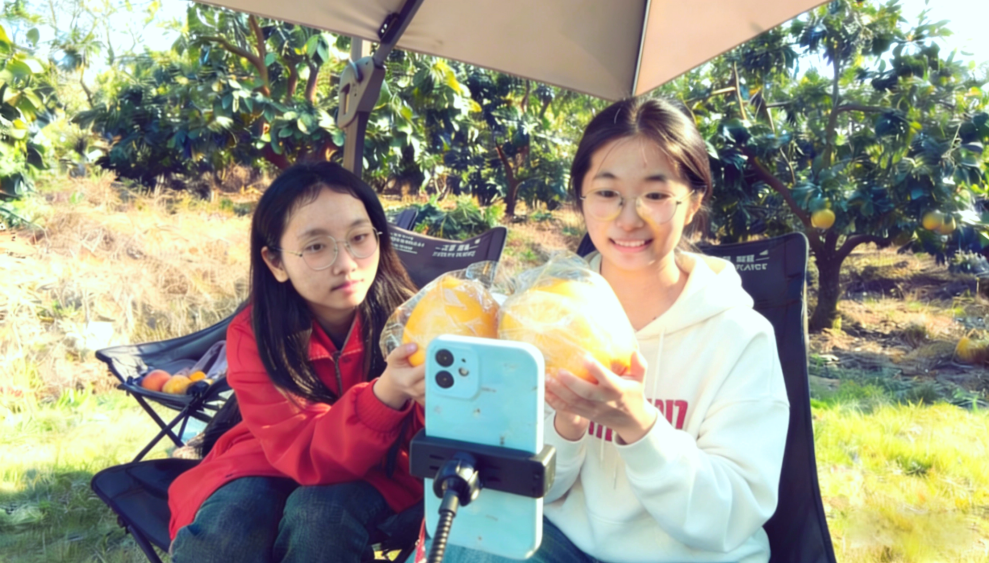 活动中,团队成员在果农指导下参与采摘等农事劳动,亲身品尝柚类水果的美味;随后分组开展直播带货,通过“现摘现卖”的产销直营模式推广新鲜柚子。直播过程中,成员们不仅生动介绍产品特点,还与观众互动答疑,展现青年视角的创新活力。现场氛围轻松热烈,既呈现了果园的自然风貌,也传递了农作劳作的质朴魅力。