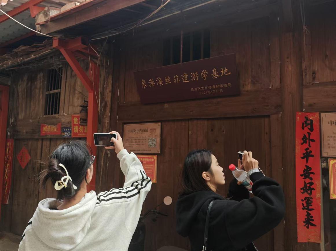 实践队首站抵达藏于百年古街的泉港海丝非遗游学基地,队员们纷纷驻足拍照,用镜头定格这份承载海丝贸易记忆的历史标识,在古街烟火气里探寻商船靠岸、货物流转的往昔图景,感受此地作为海上商贸节点的繁华余韵,沉浸式触摸海丝文化历经岁月沉淀的传承温度,读懂这片土地与海洋相融共生的文化根脉。